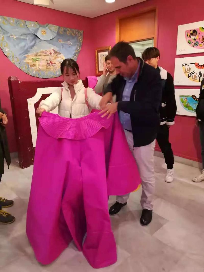 现场的气氛非常热烈,学生与老师和参展人频频互动。Verónica教授告诉我们,斗牛时用到的红披风非常重,基本上在8到10公斤左右,他还让同学们尝试斗牛动作,周围的人配合着大喊Olé来加油助威,气氛非常欢乐。