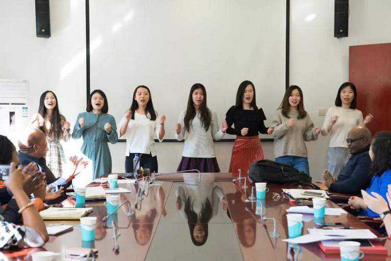 2015级斯瓦希里语专业学生为坦桑尼亚代表团献上斯语小合唱。坦桑尼亚代表团和留学生们反应热烈,现场气氛十分活跃。