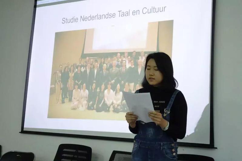 首先,荷兰语班班长张轶弛向参会的老师和同学们介绍了我院荷兰语专业的发展概况及2015级荷兰语班的基本情况。接下来,刘子源同学为大家朗诵了他创作的荷兰语专栏文章,视角独特,幽默风趣。随后,团支书刘勇亮就荷兰的留学生活发表感想,内容丰富,感情真挚。此外,我院荷兰语班同学们还展示了在荷兰制作的生活短片及荷兰语配音片段,同学们精心制作的视频赢得了在场观众的阵阵掌声。