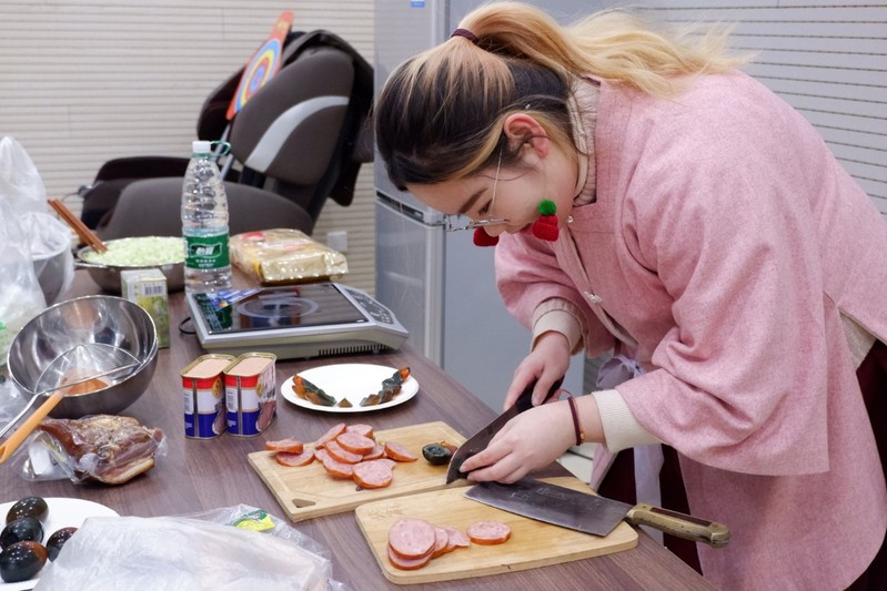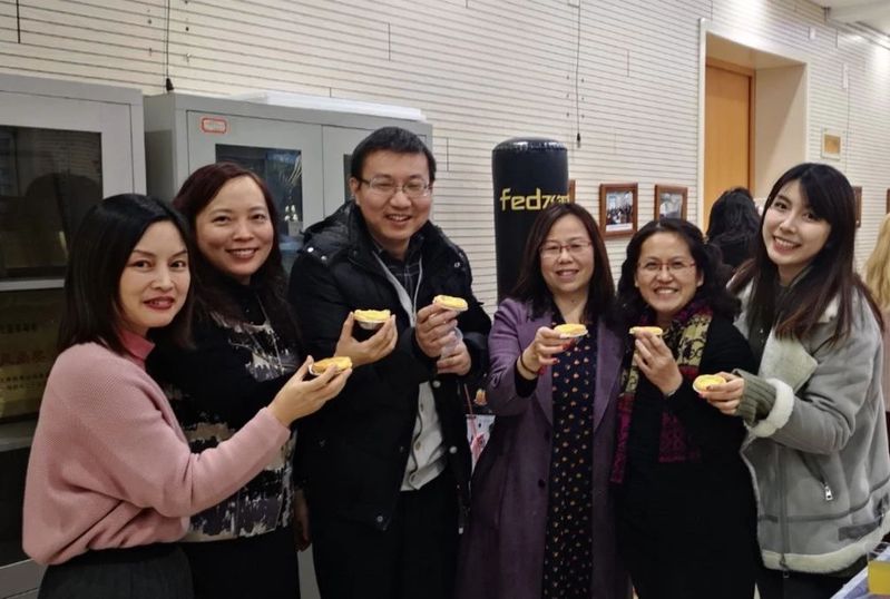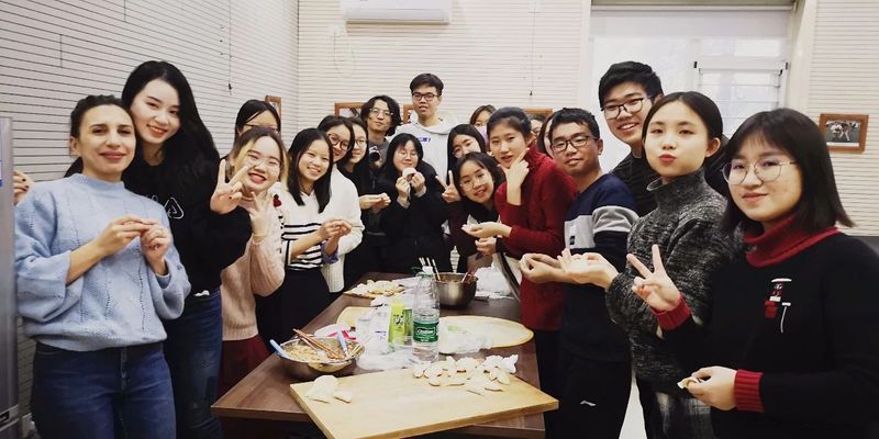 本次活动由法语班全体师生自费组织。为了这次欢送会,班主任陈明珠老师和各位同学们已精心筹备了几周的时间。同学们带来了蛋糕和装饰物,老师们带来了自己和家人的拿手菜、零食、水果等各色美食。既有诱人的中式美食:饺子、熏鱼、藕夹、自制香肠、扒猪脸、火腿等,也有洋气的西式食品:法棍、金枪鱼沙拉等。活动以大家一起包饺子作为开始。饺子一向是中国传统节日里的重要主食,通过此次大家一起包饺子的经历,身处异乡的同学们感受到了大家庭的温暖。Magali是第一次亲手包饺子,不少同学也是初次“触电”,大家包出的饺子形态各异,有圆的、亦有扁的;有“传统而经典”的,亦有“新颖而独特”的。包饺子的同时大家纷纷聊起了各自家乡的习俗,你一言我一语,着实其乐融融。