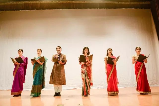 随后,我院14印地语班和15孟加拉语班的同学带来了精彩的文艺表演。印地语班的同学朗诵了印度著名诗人泰戈尔《吉檀迦利》选段。作为泰戈尔的巅峰之作,《吉檀迦利》结合了东方文化的典雅与西方文化的人文精神,而台上的同学们全情投入朗诵,不仅展现出诗中的文化交融,更展现了未来中印文化交流使者的风采。我院孟加拉语班同学也登上舞台,用充满印度民族特色的歌舞表演将晚会推入高潮。舞蹈《Gon Gon Gona Re》中,身着红裙的少女跟随着鼓点的节奏舞动,为传统的民族舞蹈平添了一抹青春的亮色。在歌曲《我与你相识,我的外国朋友》中,同学们更是借曲中字句将对远道而来的宾客的欢迎之情娓娓道来,深深地打动了在场的印方代表团成员。