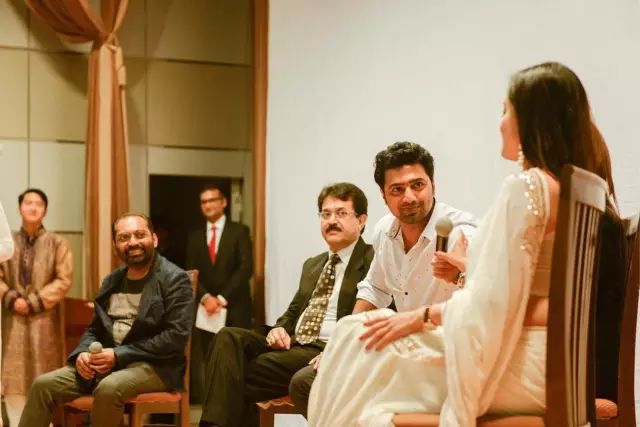 最后,印度代表团副团长蒙代尔先生,著名演员、国会议员阿迪卡里,以及著名演员阿宁迪亚·查特吉也走上舞台,在电影放映前与现场的同学们进行了印度歌曲合唱以及交流答疑等环节。