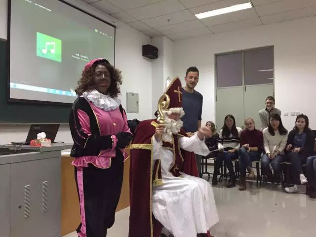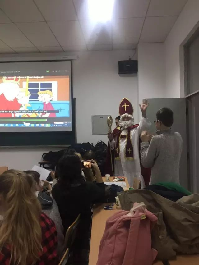 荷兰师生也为此次活动做了非常充分的准备。首先,荷兰学生在此次文化交流活动中为荷兰语班同学带来了精彩的演讲,详细向同学们介绍了荷兰林堡省的地理及文化历史等相关知识。之后荷兰师生也为荷兰语班同学们带来了一场盛大的荷兰传统节日Sinterklaas的庆祝宴会。Sinterklaas是荷兰最为传统的节日之一,同时是荷兰语学习者必须要深入了解的内容。