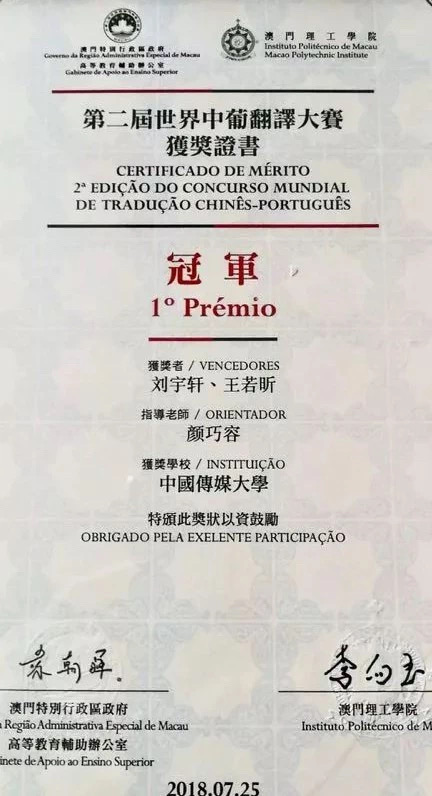 7月25日,“第二届世界中葡翻译大赛”颁奖典礼在澳门理工学院圆满举行,大赛各奖项揭晓。我院15级葡语专业学生刘宇轩、王若昕和指导教师颜巧容组成的参赛队伍获得此项世界级翻译赛事的冠军!