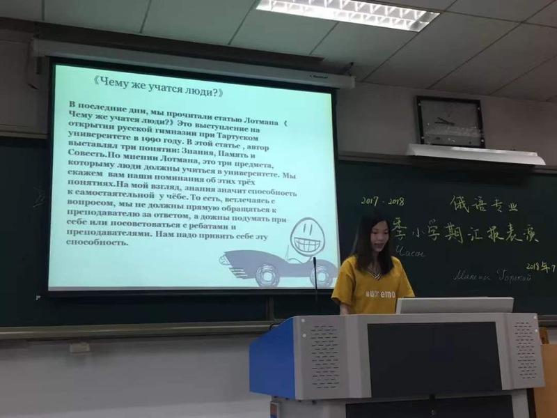 首先是2016级俄语专业带来的“夏季阅读”活动展示环节。在这个夏季学期,同学们在凡保轩老师的带领下深入研读了原苏联著名符号学家尤里·洛特曼的演讲《人们学习什么?》。16级代表卢佳欢同学为大家简要介绍了这篇演讲的主要内容与内在理路,并从现实角度谈了同学们对演讲中“智慧与良心”概念的理解。