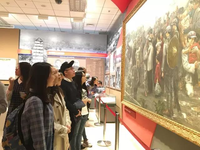 展厅内,党员师生们跟随讲解员,走过一面面展览墙,一个个展览柜,还参观了逼真还原长征实况的情景展览。其中,一幅名为《我们一定会回来》的油画吸引着同学们的目光,它描绘了红军们远征前告别乡亲父老的场景。画中的战士们有的在与父母相拥而泣,有的在安慰依依不舍的妻儿,还有的在相互凝望,无声无言。参观展览的同学中,有许多人为了赴京求学而告别了家乡亲人。在这幅油画作品前,仿佛一瞬间时空交错,80年前远征战士们的五味杂陈同样呈现在了观展同学们的心中。