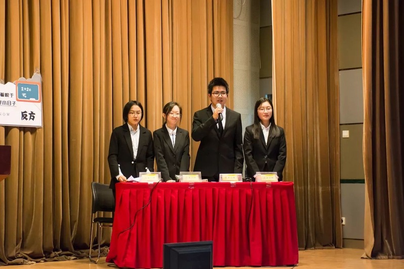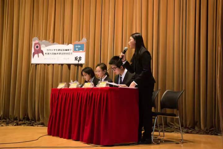 我校“思辨之音”新生辩论赛已经走到了第十一个年头,该项赛事旨在普及辩论,为大一新生搭建辩论舞台。在校辩论队带来的表演赛结束后,决赛双方登场亮相。我院作为反方,观点为“当今大学生更应该过好小日子”。三辩刘钧泓(17英语)针对正方一辩的开篇立论提出“着眼大目标更应该注重过程还是结果”的质询。随后,一辩李琪琪(17普什图语)在开篇立论中提出,当今大学生普遍存在压力大、对目标比较迷茫的状态,而过好小日子能够获得不逊于实现大目标的幸福感。在自由辩论环节,双方的辩论更加激烈,二辩段婧(17英语)强调过好小日子能够丰富当代大学生的眼界。最后,四辩俞楚婷(17俄语)在结辩中以“过好小日子是与自己握手言和的开始”做结尾,为我方的陈述画上句号。