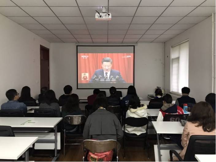 10月18日上午,在我院党委组织下,我院办公室党支部部分教师、全体专兼职辅导员、部分研究生本科生同学在学院楼109室集体收看十九大开幕式,学习习近平总书记的报告。我院其他师生党员也通过网络、电视等渠道收看大会盛况。