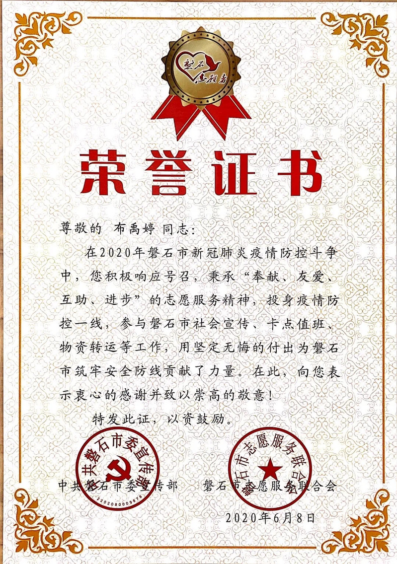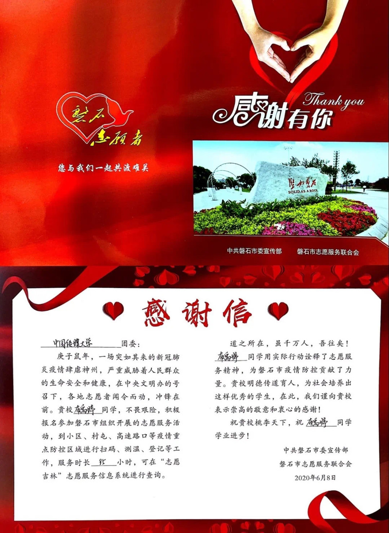 近日,磐石市委宣传部、磐石市志愿服务联合会向我校团委发来感谢信,感谢我院2019级法语专业布禹婷同学以实际行动诠释志愿精神,为磐石疫情防控贡献力量。