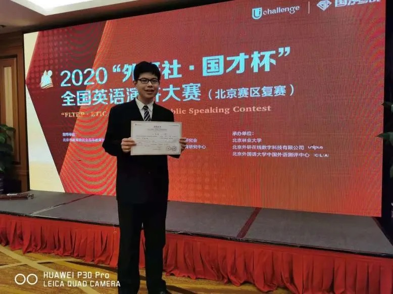 11月8日,2020年“外研社·国才杯”演讲大赛北京赛区复赛在新世纪日航饭店成功举办,我院英语系18级翻译专业的朱祥逸同学荣获北京市一等奖。
